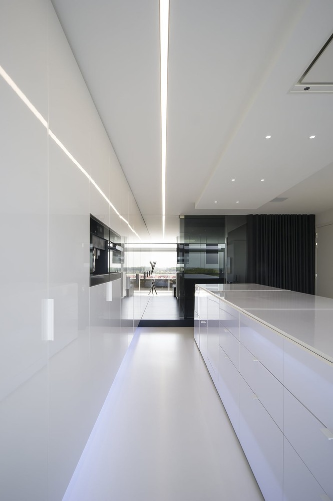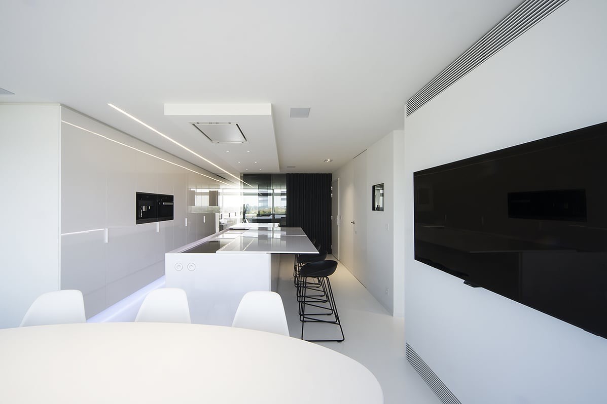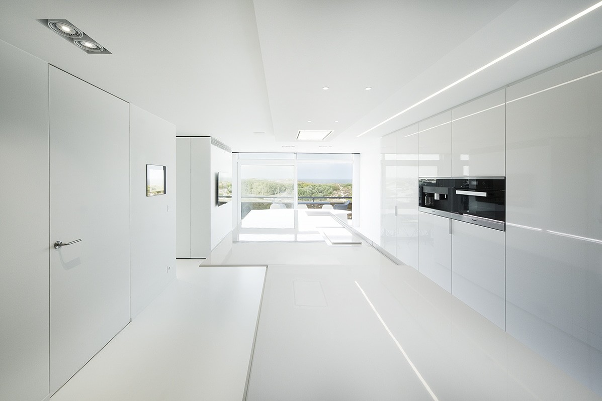 Vanuit de leefruimte geniet u van een fenomenaal panoramisch zeezicht, dat elke dag opnieuw een vakantiegevoel oproept. De doordachte indeling en grote raampartijen zorgen voor een overvloed aan natuurlijk licht en een open, ruimtelijk gevoel.