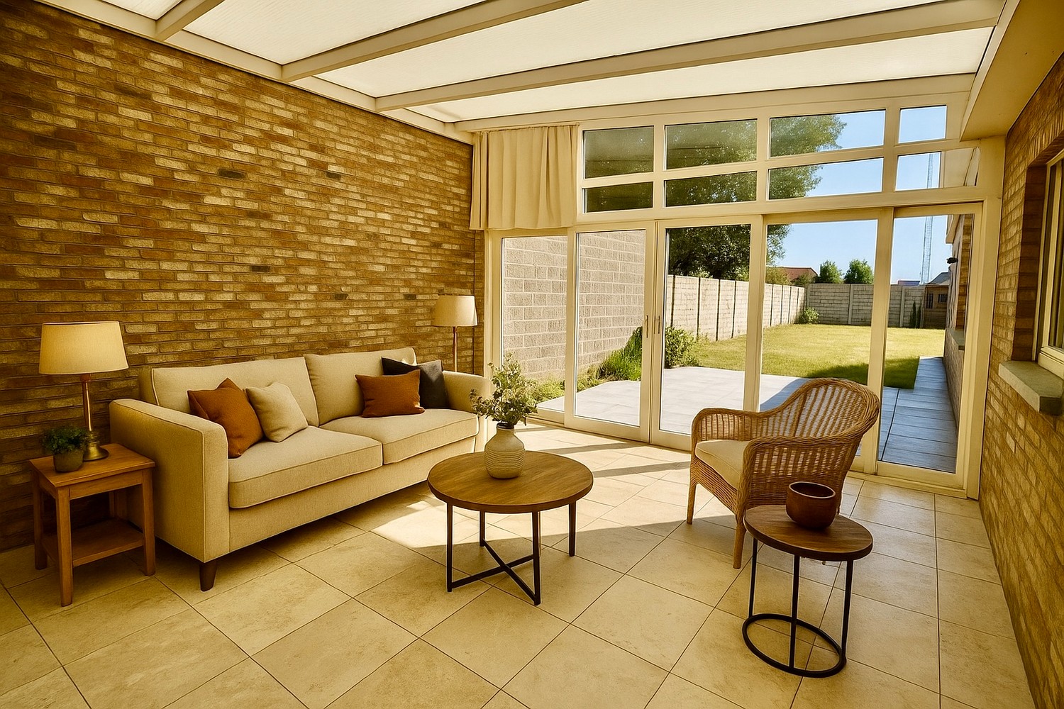 Bij de foto's van de leefruimte, veranda en de slaapkamers zijn illustratieve foto's bijgevoegd.