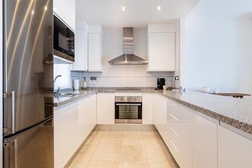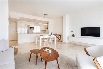 De hoofdslaapkamer beschikt over een en-suite badkamer en directe toegang tot het terras. De tweede slaapkamer is ruim en licht. De woning is afgewerkt met hoogwaardige materialen, voorzien van airconditioning en vloerverwarming in de badkamer.